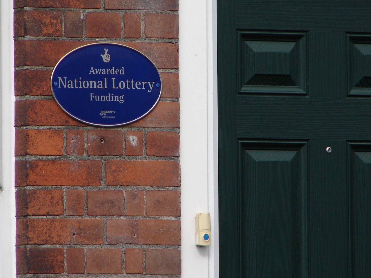 We cross the road and spot a blue plaque on the row of terraced houses. No public right of way! So we take a closer look from behind the wall. The plaque reads National Lottery.